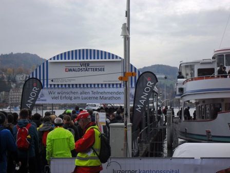 Durch die Zeitumstellung kann ich 1 Stunde länger das feine Hotel direkt am See auskosten, bis ich mich um 07.30 Uhr auf den Weg zum Start mache. Mit der S-Bahn geht es von Horw nach Luzern und als besonderes Schmankerl mit des Schiff zum Verkehrshaus (Start/Ziel).