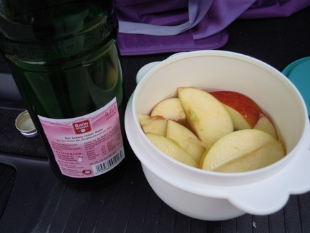 Hier ist unsere persönliche Verpflegungsstation am Auto, mit Wasser und Äpfeln.