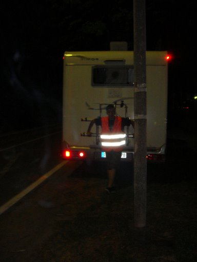 tiefer Nacht fuhren Begleitfahrzeuge mit betreuendem Blick durchs Feld.