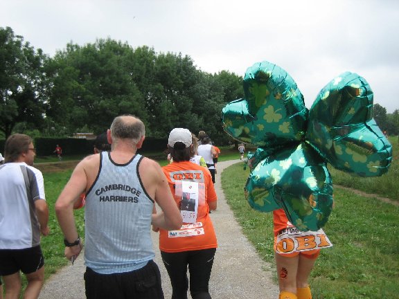 "Zugläuferin 4:59h" Angela für Team Obi, mit einem Kleeblatt.