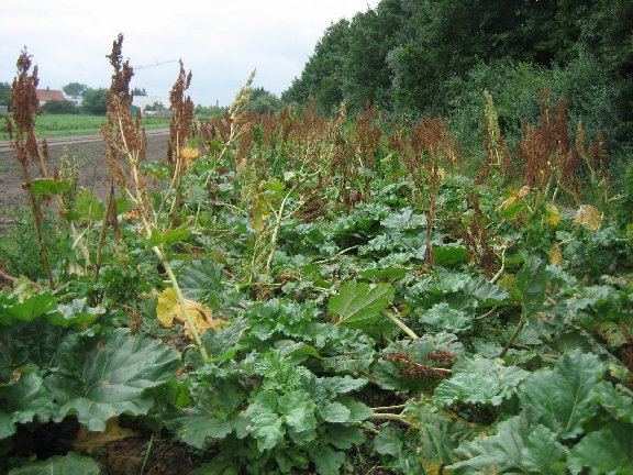 Hier sieht man blühende Rhabarberfelder und...