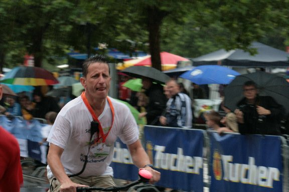 Bernd (organisator) begleitet den führenden Läufer, aber der Regen