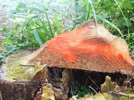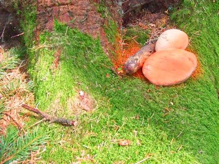 Orangerot markierte Steine im saftgrünen Waldmoos markieren den