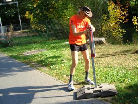 Auf unserer 2. Runde: Erwin korrigiert ein km-Schild. |