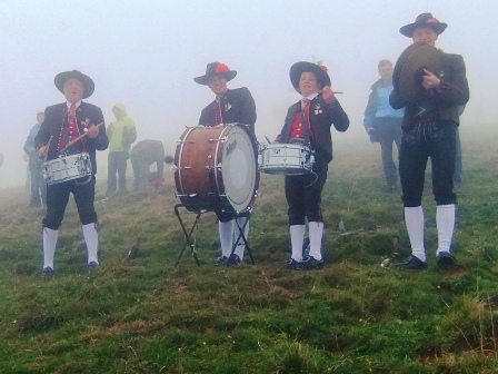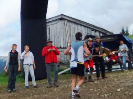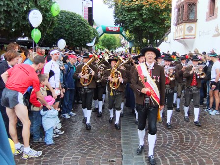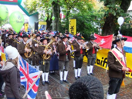 am Ziel spielt eine Blaskapelle fröhlich auf.
