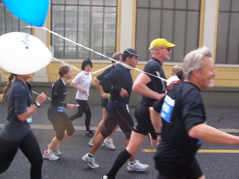 Eine Gruppe fröhlicher Zugläufer (4:30) kurz nach dem Wendepunkt.