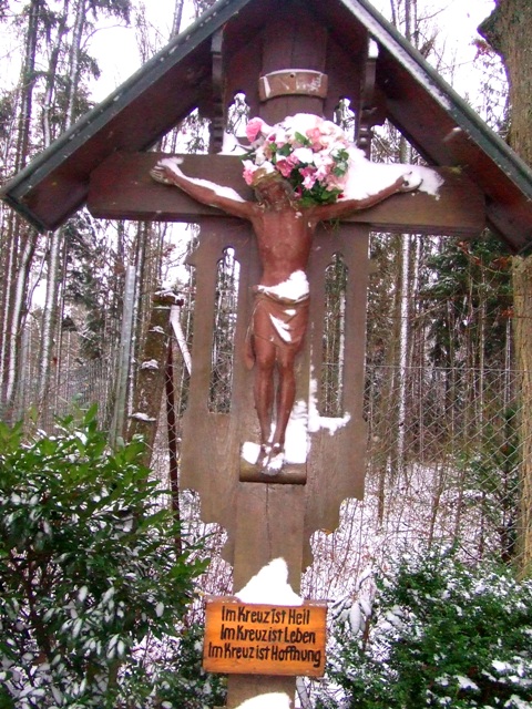 Jesus hängt wie immer, nur jetzt mit Schnee drauf