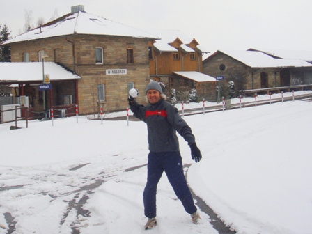 Pass bloß auf, sonst fliegen die Schneebälle (am alten Bahnhof in Windsbach)