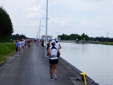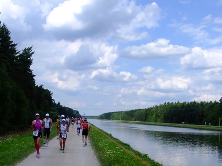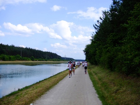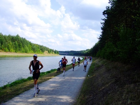 Vom anderen Ufer des Kanals aus gesehen: Staffelläufer überholen