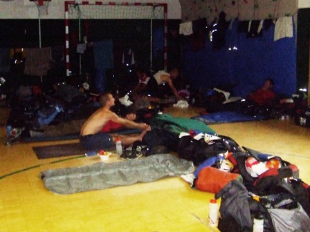 Sachen ins "Camp" (Sporthalle), duschen... |