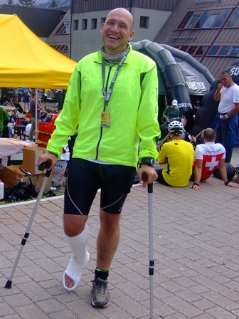 Im Ziel lacht er wieder: Ab nun halt mit Gips |