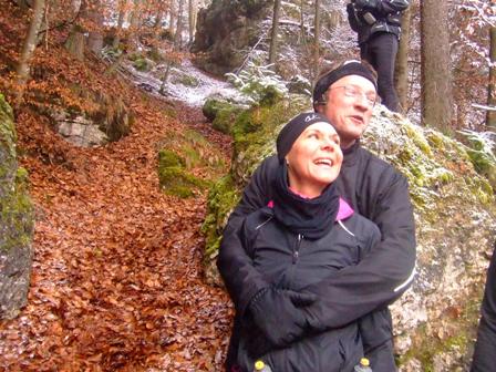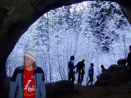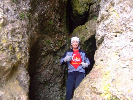 Schwester Susanne aus Tirol am Eingang zu einer Sündenhöhle |