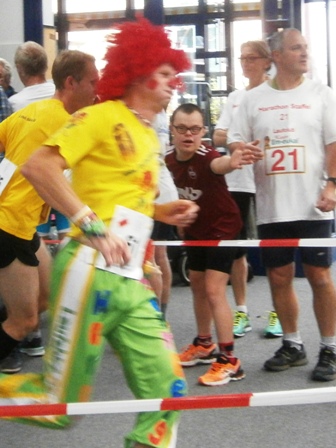 11. Indoor-Marathon Nürnberg "Draußen laufen kann jeder", hält einer der begeisterten Fäns ein Schild hoch. In der Tat ist drinnen laufen schön, nicht nur wegen dem Wetter. Hier zu Lionhearts Bericht + Bildern |