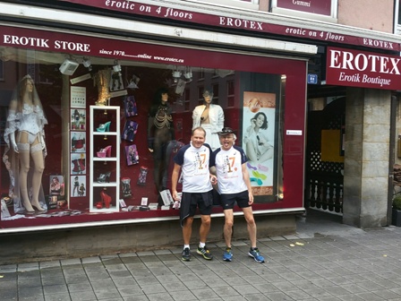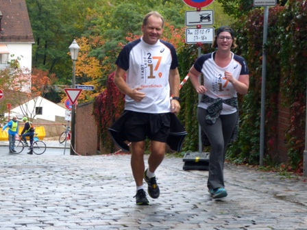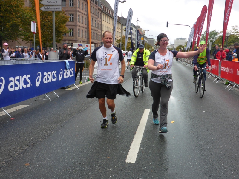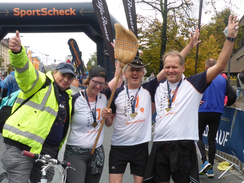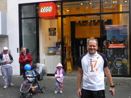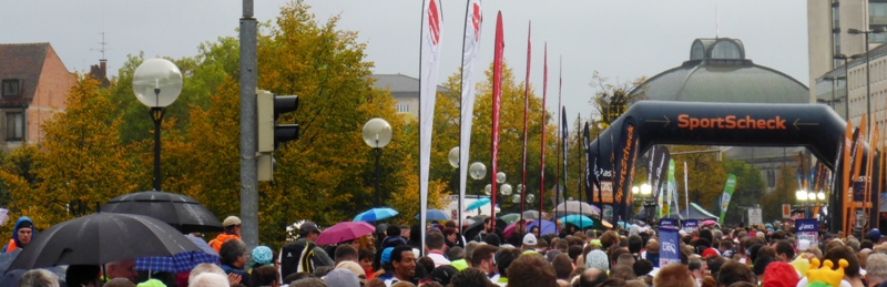 Das Wetter ist wieder einmal regnerisch und kühl. Die alljährliche Routine: Gewimmel vor dem Opernhaus beim 10km-Start (11:30 Uhr). Jeder hat sein Shirt an (=Startberechtigung) und den Zeitmess-Chips am Schuh. - Und los geht's, gaaanz hinten und gaaanz langsam. Als nach 500m das Startgetöse verhallt, haben wir autofreie Hauptstrasse, das gibt es nur 1x im Jahr in Nürnberg. Na schaumermal, wen wir heute begleiten? Wer letzter Läufer ist, das wechselt unterwegs.