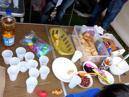 ...es gibt Papua-Neu Guinea Schokolade, Apfelsaftschorle, Wasser und Cola. Jeder hat seinen eigenen Becher, der aufgefüllt wird. Es gibt Haferschleim, Müsliriegel, süße oder salzige Kekse, Bananen, Nüsse und saure Beeren