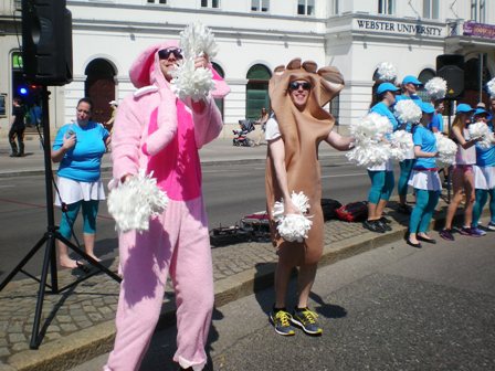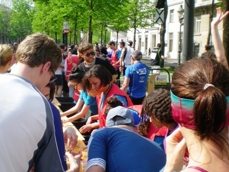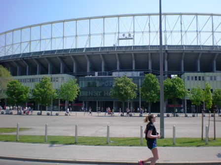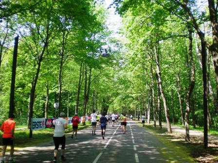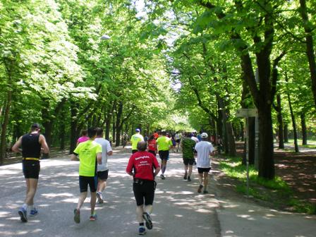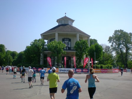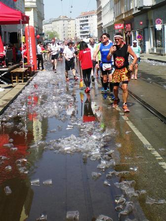 ...Helfern unmöglich so schnell die Becher aufzufüllen. Also werfen sie diese in die großen Wasserzuber, was dazu führt, das wir Läufer mit dem „Kampf um den Becher“ beschäftigt sind. Weiter geht's über die Schüttelstraße, an der Urania Sternwarte vorbei