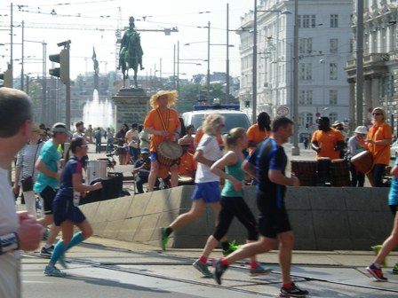 Am Schwarzenbergplatz feuert uns eine Percussion-Gruppe an