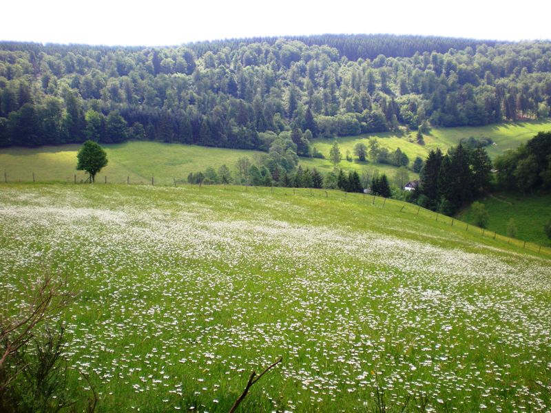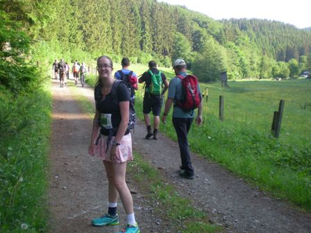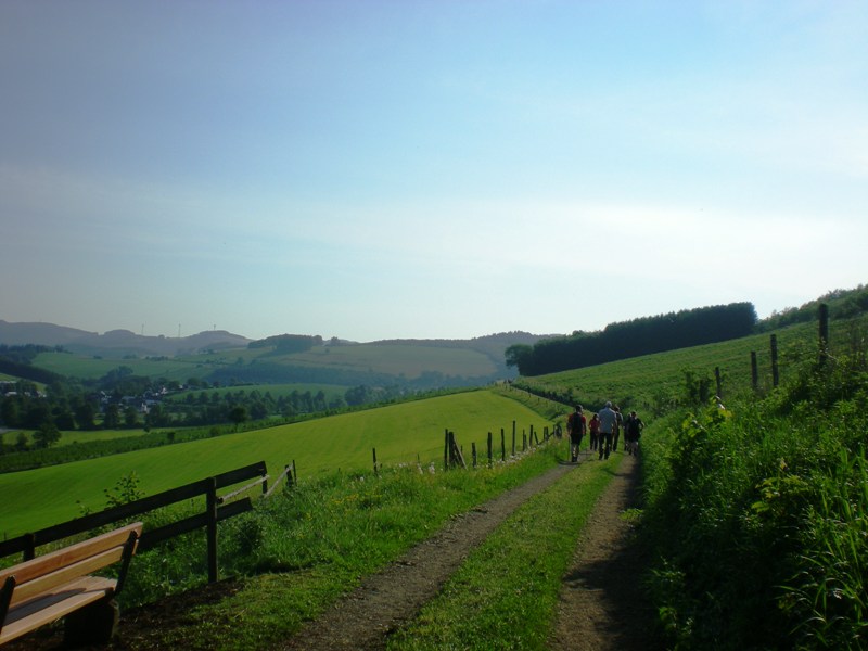 Bödefeld voraus. Wir dürfen im Schatten des Waldrandes bleiben. 2017 musste man noch über die Wiesen in der prallen Sonne laufen