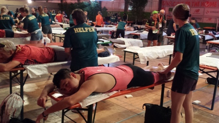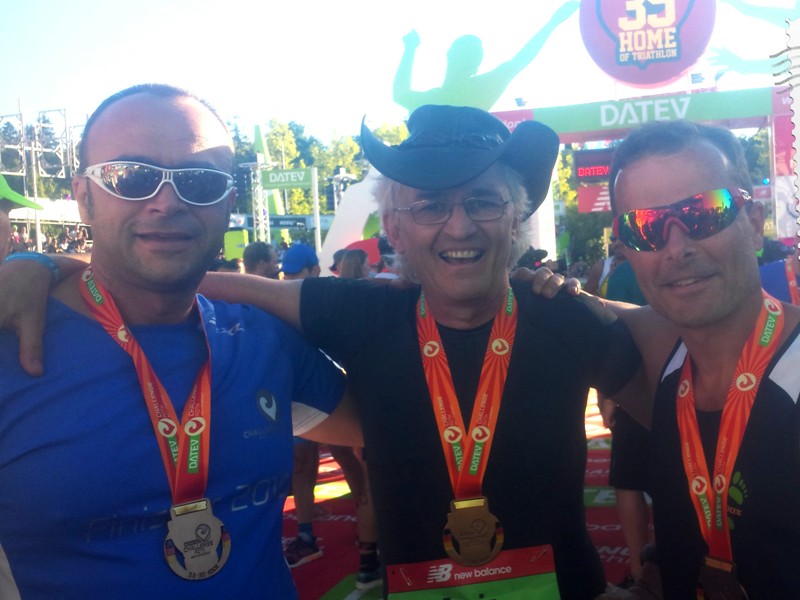 in aufgeknöpften Triathlonshirts, Schwämmchen unter deren Trägern,