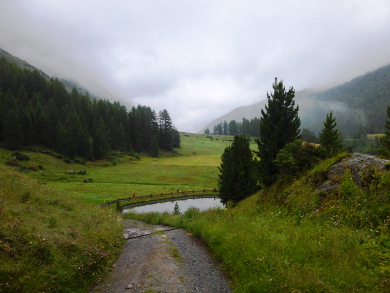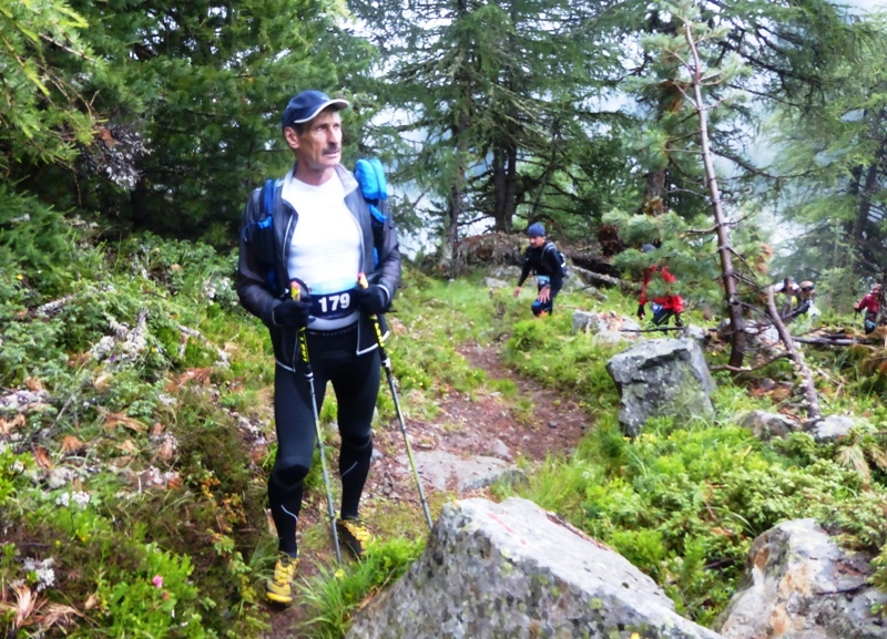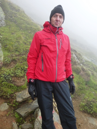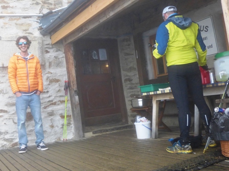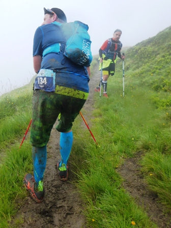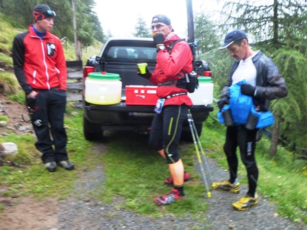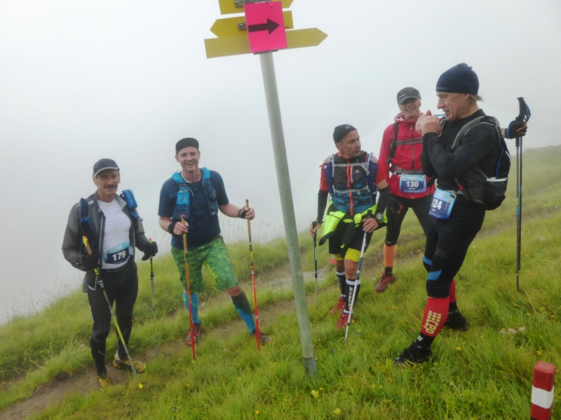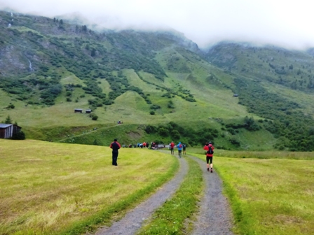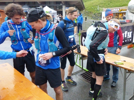 Samstagmorgen: Leider  ist die Wetterprognose falsch. Wir starten nach Racebriefing und Ausrüstungskontrolle um 7 Uhr bei leichtem Regen. Die Wolken hängen tief in den Bergen, also keine Aussicht beim Trail-Gletscher-Run.