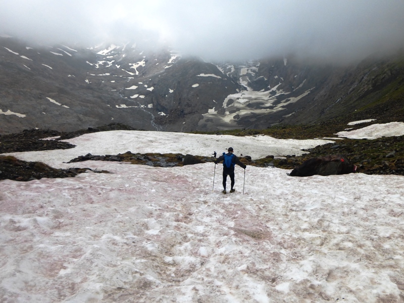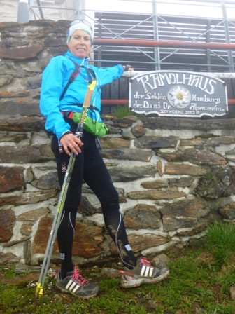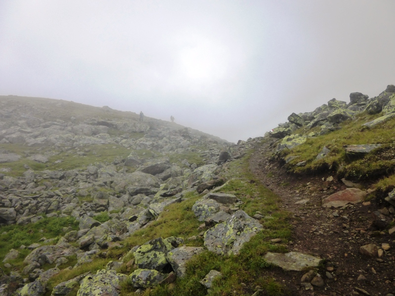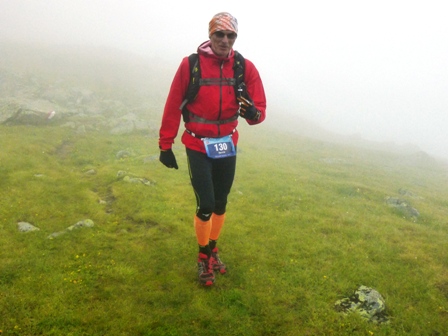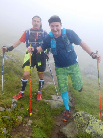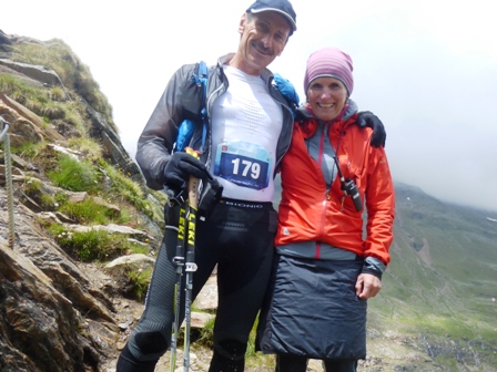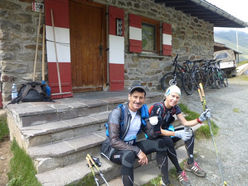 Wir bewegen uns in der hochalpin Welt, meist über 2.000 m. Als höchsten Punkt erreichen wir sogar 3.002 m (Ramol-Haus). Da gibt es eine Verpflegungsstelle, und wir können uns in der Hütte wärmen. Das tut wirklich gut. Die erste Hälfte des Tages fordert viel von uns Läufern: Wind, Nebel, leichter Regen und nur 5°C. Wir tun uns zusammen, laufen in kleinen Gruppen. Das lenkt ab. Wir hören ein paar Geschichten und die km vergehen leichter.