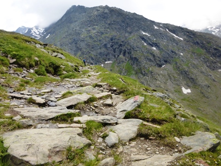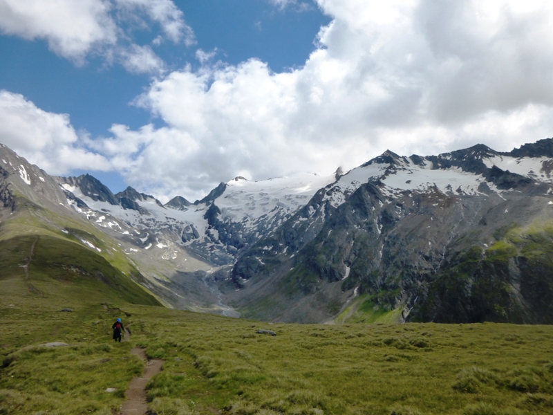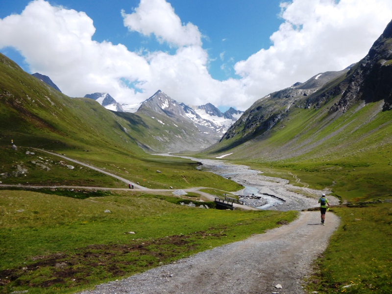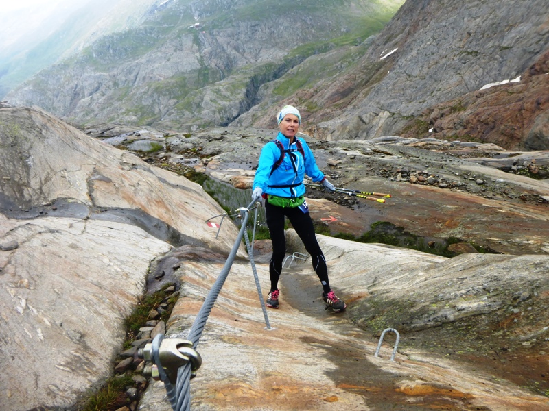 Erst am frühen Nachmittag werden wir endlich mit sensationellen Ausblicken belohnt und wissen warum wir hier sind. Sehr spektakulär ist die Piccard-Brücke, die die Bergwelt verbindet. Ich wäre am liebsten ein zweites Mal darüber gelaufen. So genießen wir dann doch noch alles von Hochalmen, Weiden bis zu Gletschern und Schneefeldern. Es gibt Wasserfälle, Almrauschhänge und super Trails. Und es kommen sogar noch Sonnenstrahlen zum verwöhnen.