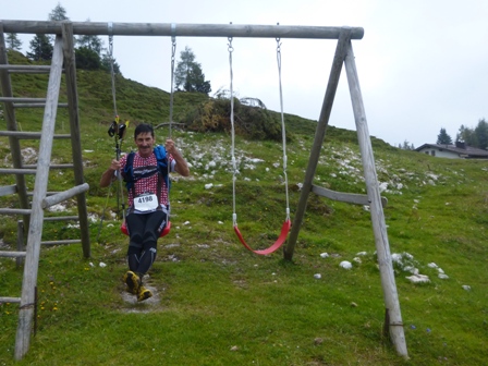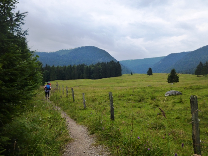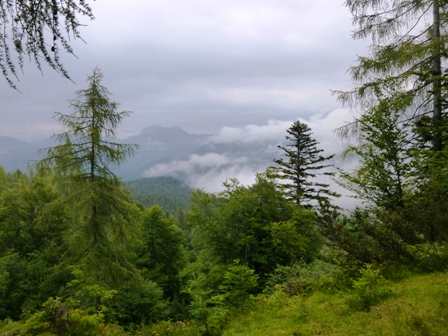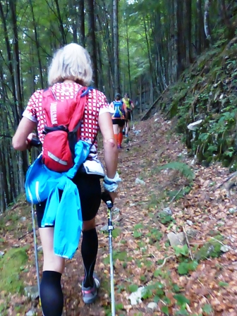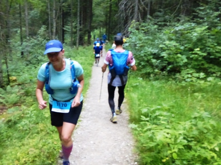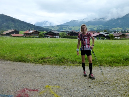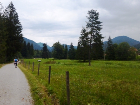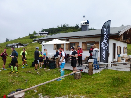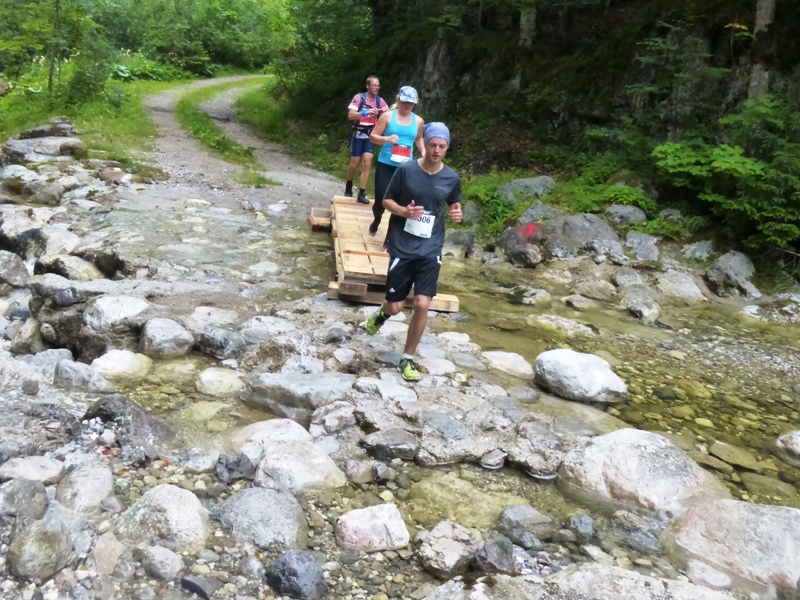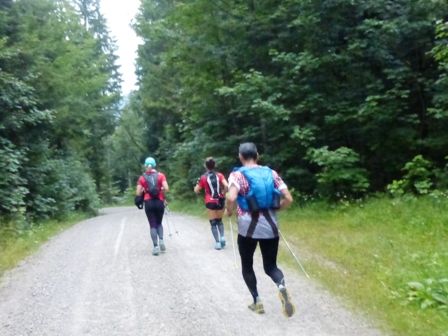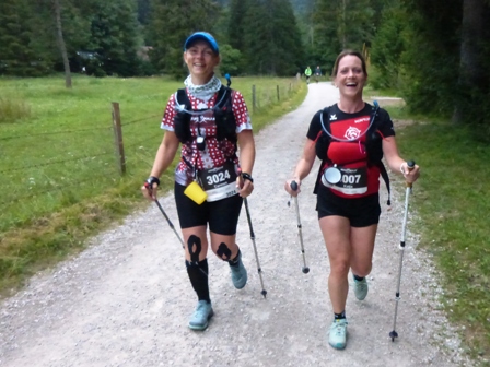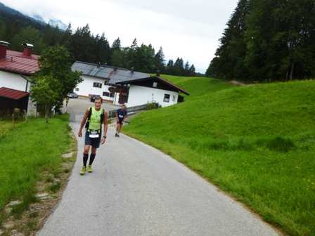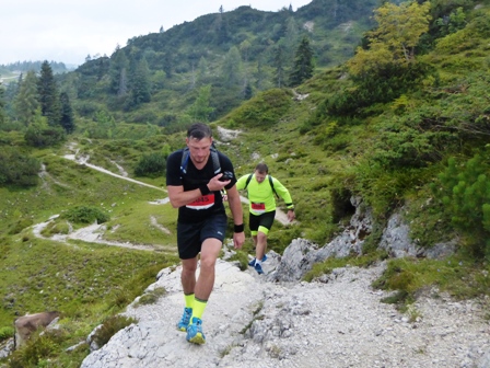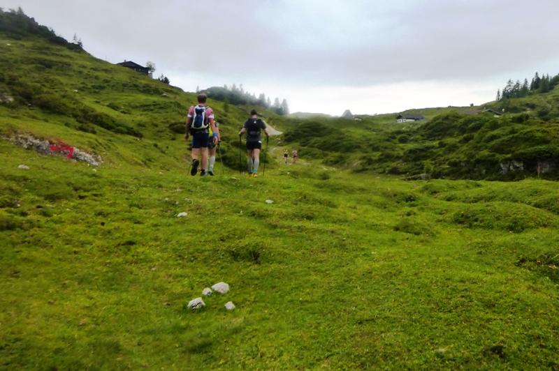 Pünktlich um 6 Uhr starten wir und hoffen, dass es mit dem Wetter klappt, denn es ist Gewitter und Regen angesagt. Natürlich sind viele fränkische Lauffreunde da und ich fühle mich wie zuhause. Wir laufen zuerst auf Wiesen und Waldwegen, bevor es zum ersten Anstieg geht. Danach geht es erstmal lange gut laufbar bergab, kurz etwas trinken und essen und weiter bergauf. In die Almregion mit schönen Weiden, Lärchenwälder super Trails und schönen Bergaussichten.