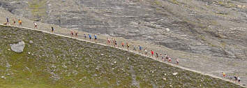 ganzen Rest der Strecke, der einem Angst machen kann. Wir dürfen nun aber erst einmal, weil es so lustig ist, die nächsten 300 Meter steil bergab laufen. Ich lass mich rollen und spurte los und vergesse lieber schnell, was gleich vor mir liegt. Ich fasse nun erste einmal in aller Ruhe Verpflegung. Dann marschiere ich stoisch los und blicke gar nicht so viel nach oben, um nicht sehen zu müssen, was an Anstieg noch vor mir liegt. Die Statistik besagt übrigens, dass auf den letzten 2 Kilometern knapp 400 Höhenmeter zu überwinden sind. Im Schnitt sind also etwa 20 % Anstieg. Passagen mit wohl 30 % - 40 % Anstieg sind durchaus dabei. Nun macht es sich negativ bemerkbar, dass ich heute reine