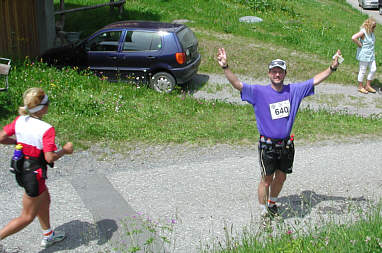 Wie erfreut sind da zwei Zuschauer, als ich sie anlache. "Was der lacht ja sogar hier", so sagen sie. "Ja" sage ich, "ich genieße die tolle Landschaft und diese schöne Bergwanderung". Wie gut dass ich nicht auf jede Minute achte und ich wirklich viel Spaß habe, da ich wegen des langsameren Tempos nicht meine "letzten" Reserven angreifen muss.
