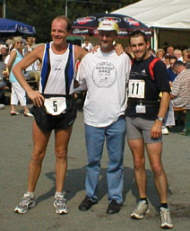 haben. Ein rauschendes Spreequellfest bei herrlichem Sonnenschein wartet auf uns. Die heutige Etappe hatte deutlich mehr Profil als die vorangegangenen 370 Kilometer. Seit Bautzen sind Steherqualitäten gefragt. Den Zieleinlauf muss man sich besonders hart erkämpfen. Ein etwa drei bis vier Kilometer kräftiger Anstieg muss bewältigt werden. Ich ziehe nach 21 KM den anderen davon, weil ich trotz meines beruhigenden Vorsprunges in der Gesamtwertung auch die Schlussetappe gewinnen möchte. Nachdem ich mich aber an einer schmalen Abzweigung verlaufen habe und so 8 Minuten Vorsprung zunichte gemacht habe, beschließe ich mit Rene gemeinsam ins Ziel zu laufen. Nach 3 Stunden und 52 Minuten laufen wir gemeinsam Hand in Hand ins Ziel und lassen uns von den mehr als 1000 Zuschauern begeistert feiern. Bei diesem Blitzlichtgewitter komme ich mir vor wie Michael Schumacher. Ich siege in neuem Gesamtstreckenrekord von 32:43:01 (Verbesserung 56 Minuten) und 33 Minuten Vorsprung vor dem zweiten Rene Strosny. Jan Nabuurs aus Holland wird Dritter Beim Spreequellfest kommt nun jeder Finisher auf seine Kosten und kann schlemmen wie „Gott in Frankreich“. Die Siegerehrung findet in würdigen Rahmen statt und jeder Einzelne wird gebührend geehrt. Mein Vater und ich sind trotz des Angebots beim Fest nicht satt zu kriegen und so gehen wir noch runter ins Dorf Eibau, um erneut ein Menü unserer Wahl zu verdrücken. Ja der Kalorienbedarf bei so einem Lauf ist immens! Dort treffen wir die befreundeten Läufer Werner Selch und Franz Häussler mit Anhang, mit denen wir einen gemütlichen Abend verbringen. Auf dem Nachhauseweg im dunklen Wald überrascht uns meine Frau Uschi, die spontan beschlossen hatte uns mit dem Auto abzuholen. Wir wollten zwar mit dem Zug zurückfahren, aber durch die Jahrhundertflut ist der Dresdener Bahnhof geschlossen. So überlegte Uschi nicht lange und fuhr die 450 KM um Shuttle für uns zu spielen, ohne dass Papa und ich damit gerechnet hätten. Dies war ein besonders freudiger Abschluss unseres Laufabenteuers. Mein Dank gilt abschließend allen Helfern, Betreuern, dem Veranstalter Ingo und seiner rührigen Frau Inge und allen Mitläufern, die sich sehr um mich als Debütanten bei so einer Herausforderung gekümmert haben. Ich kann jedem gut trainierten Läufer nur empfehlen, mal bei so einem Etappenlauf mitzumachen und freue mich schon auf meine nächste große Herausforderung – mein Lebensziel im Laufen: Dem Transeuropalauf von Lissabon nach Moskau... |