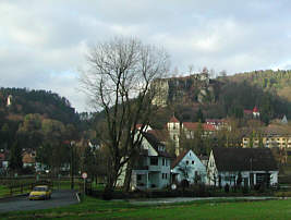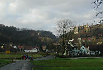 ist der Weg schwierig und es muss auf jeden Tritt geachtet werden. Muggendorf das Herz der fränkischen Schweiz / Wiesenttal Ein asphaltierter Fahrweg und dann eine Straße führen uns sicher und ohne Probleme steil bergab nach Muggendorf. Wir durchqueren das Herz der Fränkischen Schweiz und laufen nun den lieblichen Talwanderweg auf dem rechten Wiesentufer Richtung Streitberg. Ruine Neideck Wir überqueren nun die Wiesent und laufen auf einen sehr