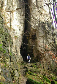 Felsenpartien. Grandioses Wiesenttal auch Schottertal genannt Wir laufen nun noch einige Hundert Meter einen herrlichen Wanderweg oberhalb des linken Wiesentufers entlang. Immer wieder tun sich schöne Ausblicke aufs Wiesenttal auf. Auf diesen Metern muss jedoch auch sehr auf den Weg geachtet werden, da dieser schwierig und schmal und leider oft auch sehr glitschig ist. Es kann daher sein, dass längere Passagen gegangen werden müssen. Riesenburg - Dramatische Riesenversturzhöhle Schließlich biegen wir ab und überqueren die Wiesent auf