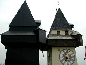 weltberühmte Grazer Uhrenturm mit "Schatten" links |