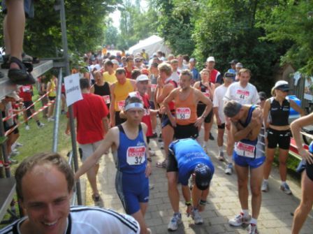 im Starterfeld ein. Schon wird heruntergezählt -10..9..8..7..6..5..4..3..2..1 Peng!! Die Läufer ziehen los in die Hitze, und sind auch schon verschwunden. |