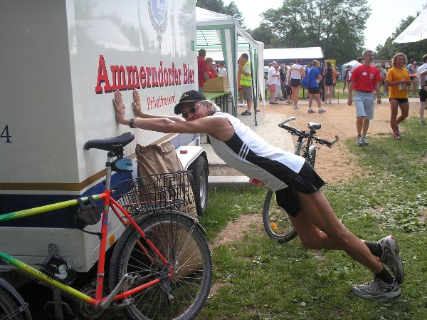 @Susanne: Hey, guten Morgen, da kommt Olaf. Er hat sich schon warm gelaufen, ist von zu Hause aus hierher gejoggt und sagt er läuft den Marathon in Ruhe, weil er ja auch wieder nach Hause muss. Hey, der Olaf wohnt in Nürnberg, schluck! 20+42+20=82km.