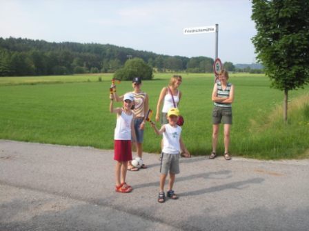 @Susanne: An der Wendemarke angekommen, finde ich es schade, dass die Hälfte schon geschafft ist. Immer wieder in angenehm kurzen Abständen kommen Verpflegungsstationen. Trinken, einen nassen Schwamm schnappen um Arme und Kopf zu kühlen – ah, das tut gut – und weiter. Susanne und ich lassen uns nicht aus der Ruhe bringen. Wir bleiben immer kurz stehen und nehmen viele Eindrücke mit. Es macht einfach Spaß. Hier ist ein kleines Mädchen, das schon fleißig ganz viele leere Trinkbecher aufgesammelt hat. Anlässlich der Fußball-WM ist sie schwarz-rot-gold im Gesicht bemalt und hat eine Girlande um. Wir geben ihr unsere Schwämme und sagen ihr wie toll wir das finden, dass sie so fleißig mithilft. Sie freut sich und winkt uns hinterher. Hier durch den Wald zu laufen ist schön. Die Luft ist sehr gut. Es sind Wolken aufgezogen und so kommt die Sonne nicht mehr voll durch. Wir laufen wieder über die Straße hinüber und da kommt uns auch schon Erwin entgegen. Hallo, hey, super! Wir klatschen uns kurz die Hand und weiter geht es. Die Marathon-Läufer absolvieren 2 Runden von Ammerndorf über Großhabersdorf zum Wendepunkt und zurück.