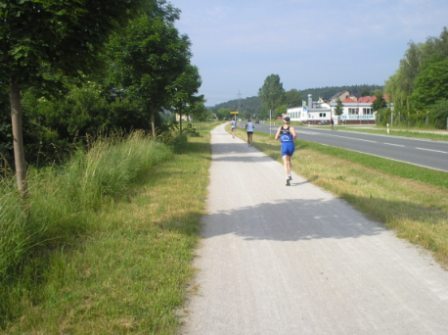 km1: für mich genau im passenden Schritt. Doch ob die neben mir dieses Tempo gehen können? Ich will so etwa 3:15 Std laufen, heute nicht so schnell. Am Start sagt Conny, die Seriensiegerin hier, sie will in meinem Windschatten laufen. Windschatten? Nein, wirklich kein Wind hier. |