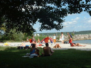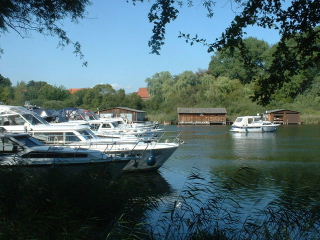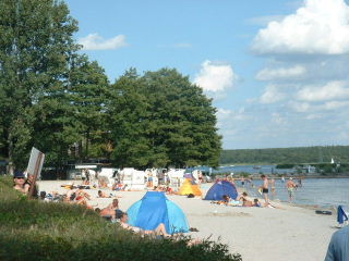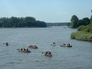 See mit Booten. Wir flachsen mit den Kindern oder Helfern an den