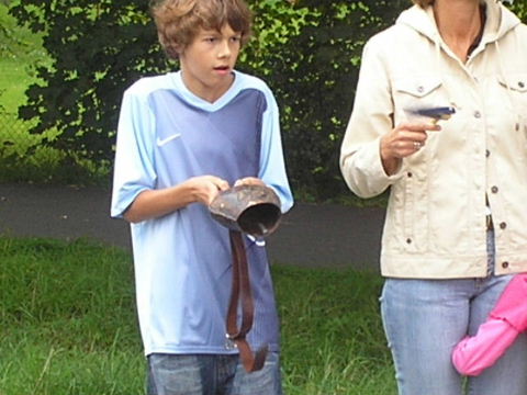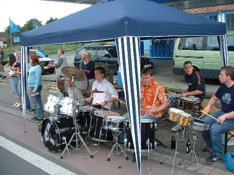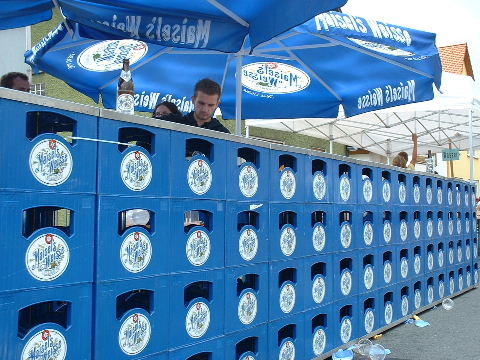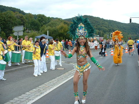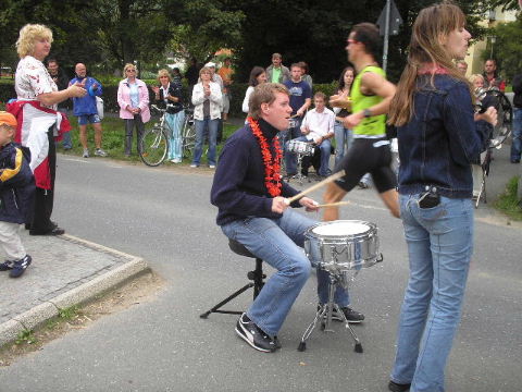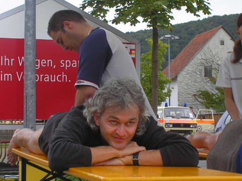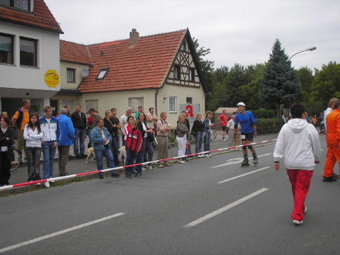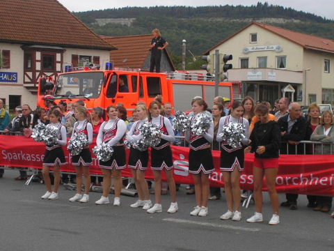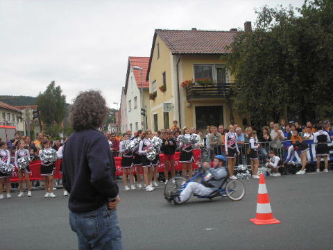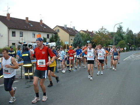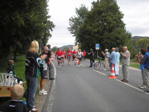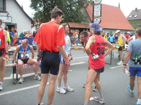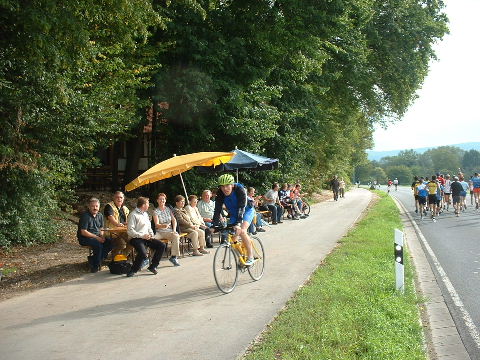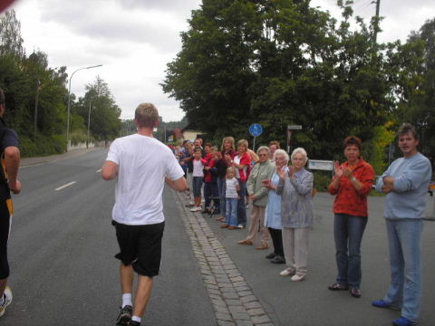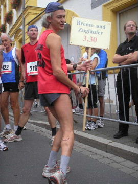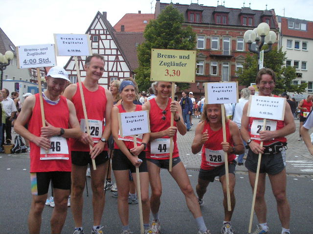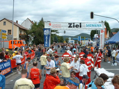 2002-Klassiker: "Helden kehren heim" Da Susanne, Erwin und die zahlreich vertretenen weiteren Team-Bittel Anhänger alle in Forchheim an den Start des Marathon gehen würden, fuhr ich in aller Frühe allein nach Ebermannstadt (Staffel-Wechsel), wo ich bereits kurz hinter dem Ortseingangsschild freundlich in die reichlich vorhandenen Parkplätze eingewiesen wurde. Ich ließ mich von der beschaulichen Atmosphäre einer sonntagmorgendlich verschlafenen Ebermannstadt einfangen und zu einem lohnenswerten Stadtrundgang verführen. Die letzten Vorbereitungen für den Lauf waren in vollem Gange und mehr und mehr füllten sich die Straßen zunächst mit Läufern, die nach Abholung der Startunterlagen mit den bereitstehenden Bussen noch schnell nach Forchheim zum Start wollten und später dann mit den zahlreichen Wechselläufern, so wie ich ja einer war. Auch an Zuschauern, die fleißig und ausdauernd Beifall spendeten mangelte es nicht. Überraschend bald kündigte der Sprecher die ersten Inline-SkaterInnen an, die durchs Ziel jagten als bereits die ersten Marathonläufer aus Forchheim hier in Ebermannstadt eintrafen. Spätestens jetzt war es mit der Ruhe in Ebermannstadt vorbei! Die Aktiven wurden vom zahlreichen Publikum begeistert empfangen. Nun hieß es auch für uns Team-Wechselläufer aufpassen, um den einlaufenden Team-Partner nicht zu verpassen. Das war gar nicht so einfach, denn es warteten mehr als 190 Wechselläufer auf engstem Raum.