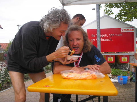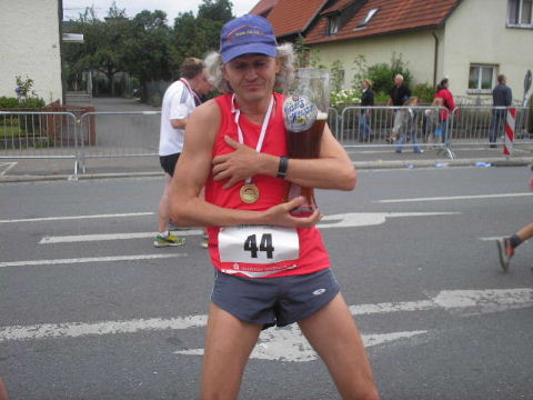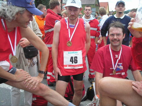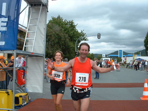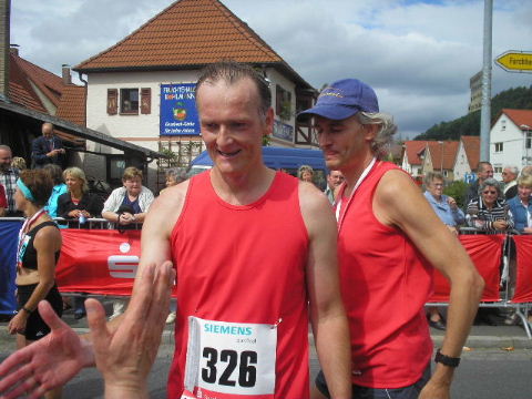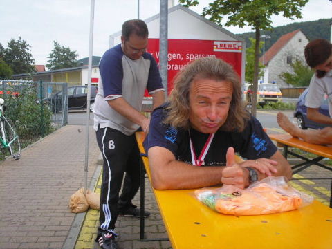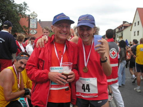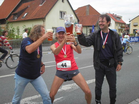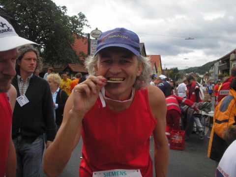 Schnell findet mich Susanne. Die Freude über den gemeinsamen Lauf verbindet und schafft Vorfreude auf die nächsten Läufe, die schon fest eingeplant sind. Erwin ist schon längst erholt im Zielbereich und kümmert sich wie stets auch um diejenigen, denen das Lächeln im Ziel nicht mehr möglich ist, leider... Auch wenn die Veranstalter des 7. Fränkischen Schweiz-Marathon 2006 die Teilnehmerzahlen des Vorjahres nicht erreichen konnten, es war ein schöner Lauf in einer reizvollen Umgebung und eine super Organisation, die Lust macht, auch im nächsten Jahr wieder dabei zu sein. Euer Staffel-Läufer