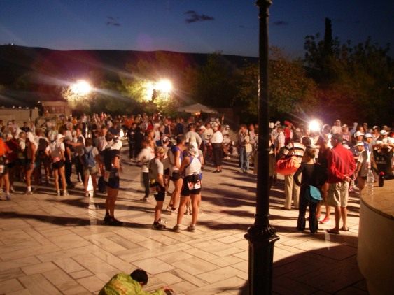 Wir stehen vor der Akropolis, die Läufer warten bis zum Start. Es ist