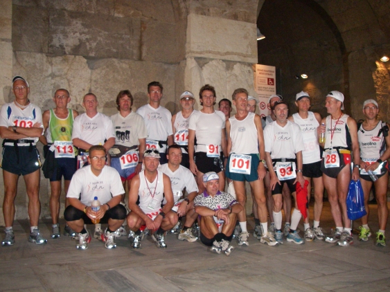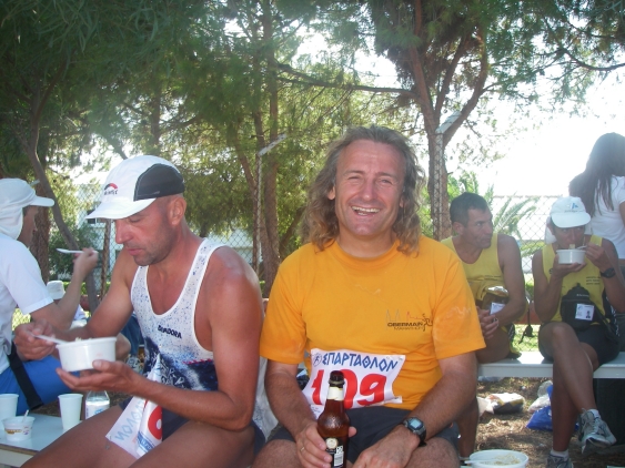 Läufer, Finisher und Betreuer. Es gibt einen Olivenkranz, eine Schale