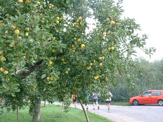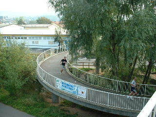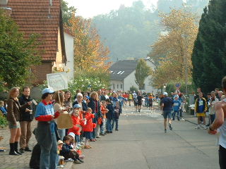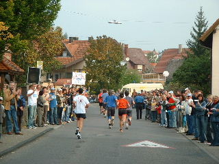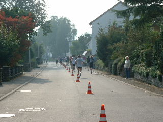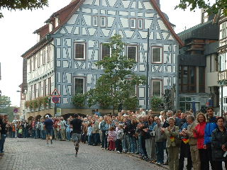 Die zweite Hälfte ist nicht so anschaulich wie die erste, hat ein paar langweilige Geraden. Es kommt leichter Wind auf, was mir gefällt, denn die Sonne wird auch langsam kräftig. Ich bin exakt im gleichen Tempo unterwegs, zugegeben flott, und überhole überraschend schnell jeden gerade erst in der Ferne aufgetauchten Mit-Läufer. Ein Sprecher gibt mir die Erlaubnis weiterzulaufen: "Au wennsch koi Nummer hesch". Ich mag die Schwaben und ihren Humor.