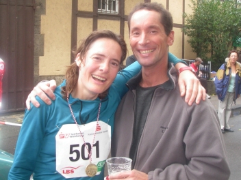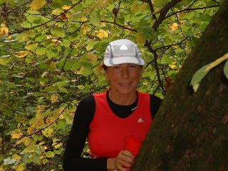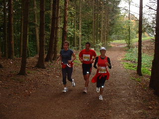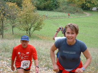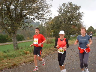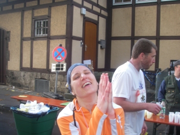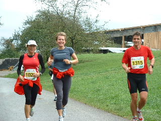Weil es ein wenig nieselt rieche ich den Waldboden und das feuchte Gras um so intensiver. Durch den Wald geht es ein Stückchen bergauf und gleich wieder bergab. Ich erinnere mich an letztes Jahr und weiß, dass die schwierigen Anstiege später erst kommen werden. Auch davor brauche ich keine Angst zu haben, den die steilen Stücke gehen wir, um mit langen Schritten ebenso schnell, aber Kräfte tankend nach hoben zu gelangen. - Hier also joggen wir mit kleinen Schritten den Weg nach oben. Das Läuferfeld hat sich schon ein wenig auseinander gezogen und die Schnelleren setzen sich immer mehr ab. Susanne, Frank und ich laufen schön konstant in einem angenehmen Tempo und bleiben zusammen. Erwin und die Anderen sind einmal bei uns, dann wieder vor uns und alle haben wir Spaß und viel zu lachen. Nach KM5 kommt die erste Verpflegungsstelle. Hier gibt es Wasser, Iso-Getränk, Tee und - ja ja jaaaaa - DIE Müsliriegel. Hier sind sie die besten Müsliriegel die ich jemals gegessen habe zu finden. Das sind richtig frisch gebackene Powerriegel aus Sonnenblumen- und Kürbiskernen, Sesam, Rosinen usw. Suuuperlecker!! Auf die habe ich mich besonders gefreut. Ha ha ha… - Weiter geht es, gut gestärkt. Die Leute am Wegesrad feuern uns an, klatschen und pfeifen. Ein paar Kinder sammeln schon fleißig die weggeworfenen Plastikbecherchen wieder ein.