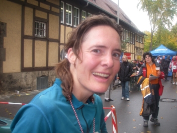Hier im Ziel ist nichts los. Wir trinken noch zwei, drei Becherchen Tee und machen uns auf den Weg zum Bus. Susanne, Frank und ich gehen also den steilen Berg hinunter zur Bushaltestelle. Die Ultraläufer müssen auch hier entlang und immer wieder zieht einer an uns vorbei. Freundliche Polizisten halten die Autos an und lassen uns passieren. Wir nehmen im Bus Platz und bald fährt er auch schon los. Die kurvenreiche Fahrt zieht sich recht lang hin, aber schließlich sind wir da. Frank verabschiedet sich hier von uns. Er wohnt nicht weit weg von Schwäbisch Gmünd und macht sich auf den Heimweg. Susanne und ich sehnen uns nach Gymnastik und Dehnen und gehen in die Sporthalle hinein. Aaahhhaa, hier gibt es ja die Massagen. Die Liegen sind nicht alle belegt und so werden wir freundlich aufgefordert doch Platz zu nehmen. Na, da lassen wir uns nicht zweimal bitten. Ich lege Schuhe und Strümpfe ab und genieße die wohltuende Massage. Ich möchte fast einschlafen, so entspannend ist die Behandlung. Meine Beine sind wieder locker und ich fühle mich sehr wohl. Susanne hat leider keine Zeit mehr und wir verabschieden uns. – Ich gehe in aller Ruhe zum Auto und hole meine Tasche heraus. Alles ist sehr nah bei einander und so bin ich ratzfatz bei den Duschen. Das Wasser kommt gut warm aus dem Brausekopf und ich fühle mich wie neu geboren. Ich kann mir richtig Zeit lassen, weil die anderen schon noch eine Weile brauchen werden bis sie im Ziel sind. – Ich bringe meine Sachen wieder ins Auto zurück und trotte zurück zum Geschehen. Beim Ziel schaue ich zu wie nacheinander die Finisher ankommen. – Ich schaue mich um und sehe Olaf stehen. Ich schleiche mich an ihn heran und zupfe an seinem Shirt. „Hey Olaf…“ Er lacht und erzählt mir wie es für ihn war. Er hat eine Läuferin ein Stück begleitet die bisher nur einmal einen Halbmarathon gelaufen ist. Sie heißt Tatjana und hat drei Kinder. Respekt. Ich sehe die Begeisterung in ihrem Gesicht. Sie „schwebt auf Wolke sieben“.