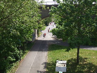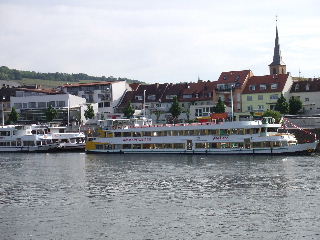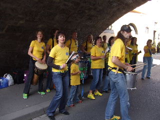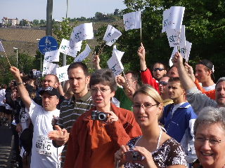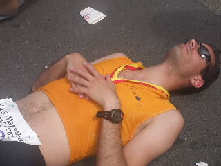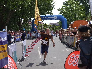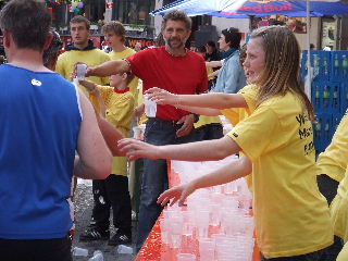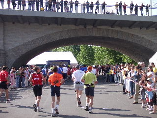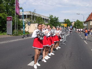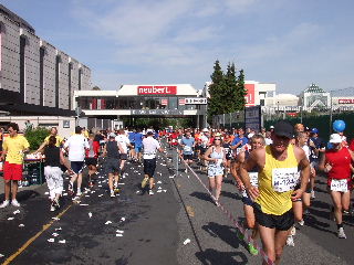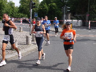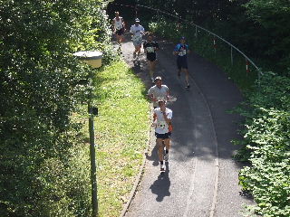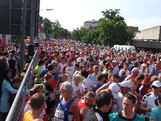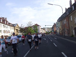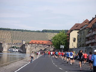 Eins, zwei, Polizei Auf der zweiten Hälfte laufe ich alleine, manchmal sehe ich keinen mehr vor mir auf 100 m. Die Polizei aber steht auf dem Posten, immer zu zweit. Sie passen auf. Eins, zwei, Polizei. Fluss Ich sehen auf den Main und mein Blick treibt auf seinem ruhigen Wasser. Fluss, du fließt in alter Weise, durch dein programmiertes Tal. In zeitloser Deutschlandreise. Töne fließen wie ein Strom den Fluss hinauf. - Wenn wir doch etwas näher am Wasser laufen könnten? Fred vom Jupiter „Der Traum aller Frauen“. – Andree grüßt mich im Vorbeiziehen. Ich fliege ein kurzes Stück mit ihm und seinem Space-Rücken-Pack, dann aber wieder in meinen Tourenwagen...