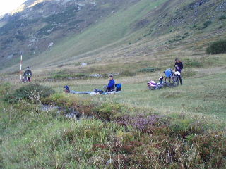 Eine Gruppe Radler baut gerade ihr Nachtlager auf einer Wiese am