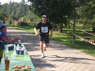 Jürgen läuft ins Ziel, vorbei am Bier |
