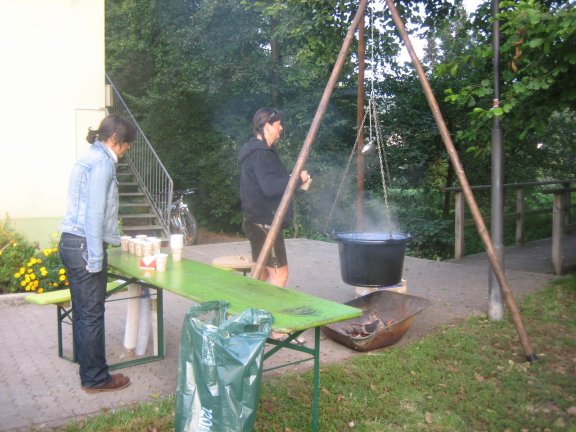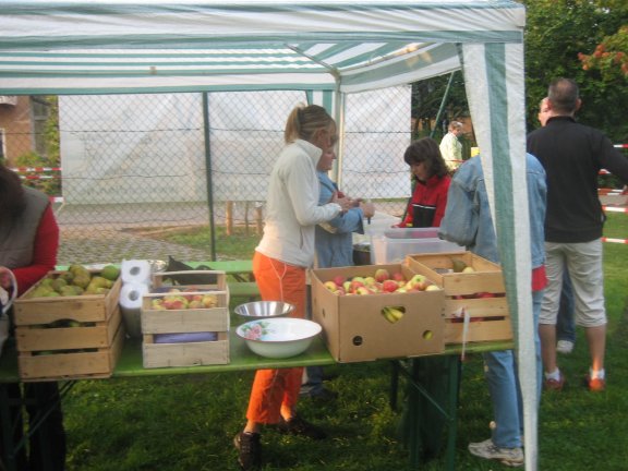Fleißige Helfer schneiden große Mengen von Äpfeln, Birnen und Bananen in handliche Portionen. Auch die schon legendären Kuchen sind schon verführerisch aufgebaut. Das ist auch ein Grund möglichst schnell das Ziel zu erreichen.