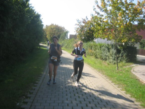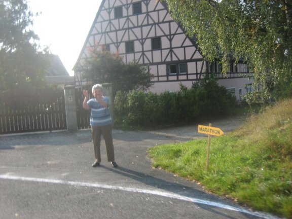 Eine einsame Zuschauerin spornte uns an. Aber wohin zeigt das gelbe Schild? Laufen wir etwa in die falsche Richtung.